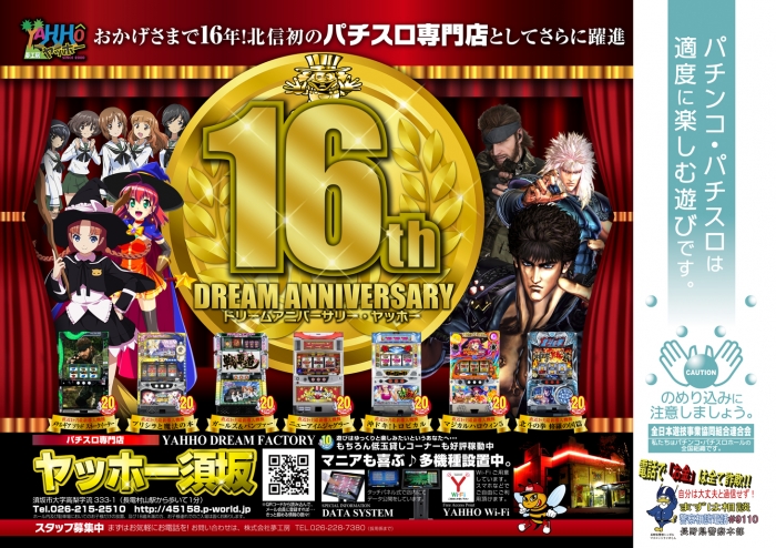 夢工房ヤッホーは2000年に誕生しました!おかげさまで、今月で北信初のパチスロ専門店として誕生してから16周年を迎えることが出来ました。これも日頃からご愛顧いただいておりますお客様のお陰です。今後とも夢工房ヤッホーをよろしくお願いいたします。