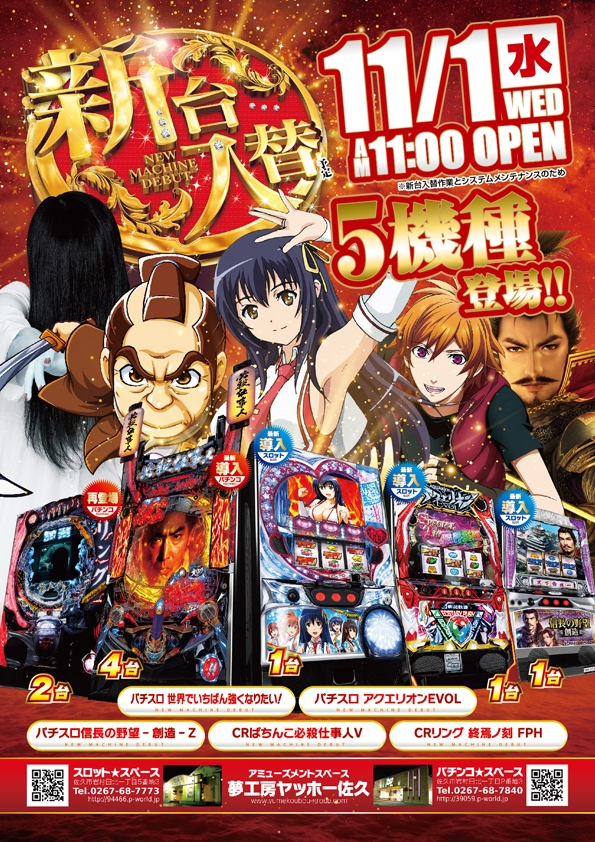 「パチスロ 世界でいちばん強くなりたい!」「パチスロ アクエリオンEVOL」「パチスロ信長の野望‐創造‐Z」「CRぱちんこ必殺仕事人V」「CRリング 終焉ノ刻 FPH」がデビュー!