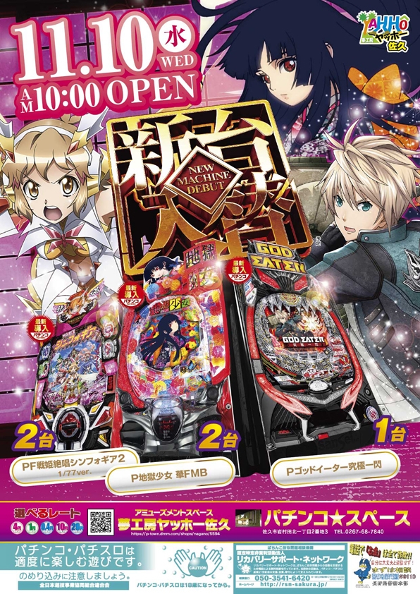 パチンコスペースに【P地獄少女 華FMB】【Pゴットイーター究極一閃MA】【PF戦姫絶唱シンフォギア2YR】が新登場!