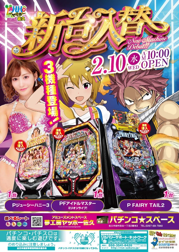 パチンコスペースに【PFアイドルマスターG】【Pフェアリーテイル2 JQD】【Pジューシーハニー3MEY2】が新登場!