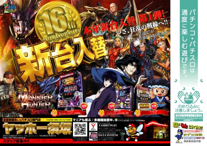 ヤッホー須坂の2017年新台入替第1弾は【モンスターハンター~狂竜戦線~】が新登場!!!