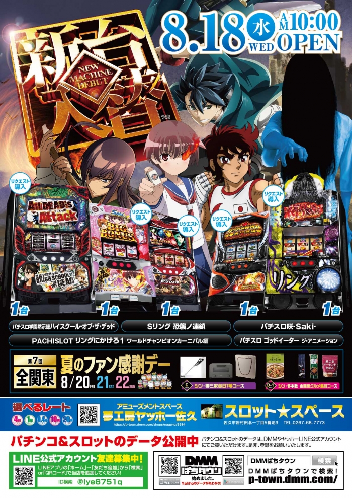 スロットスペースにリクエスト導入で【パチスロ学園黙示録ハイスクール・オブ・ザ・デッド】【Sリング 恐襲ノ連鎖】【パチスロ咲-Saki-】【PACHISLOT リングにかけろ1ワールドチャンピオンカーニバル編】【ゴットイーター・ジ・アニメーション】が新登場!