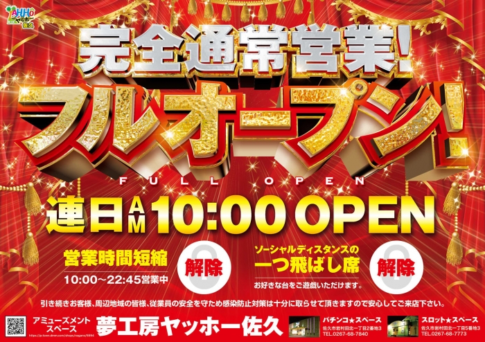 営業時間短縮も、一つ飛ばし席も、解除して完全通常営業スタイルに戻りました!!