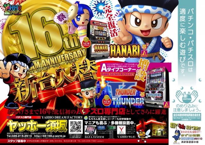 ヤッホー須坂に【HANABI~FINAL白夜ver.】が新登場!!!さらに【サンダーVリボルト】も同時デビュー!パチスロ専門店として、パチスロの楽しさを存分発揮するA-Typeコーナーが豊富になりました!!!