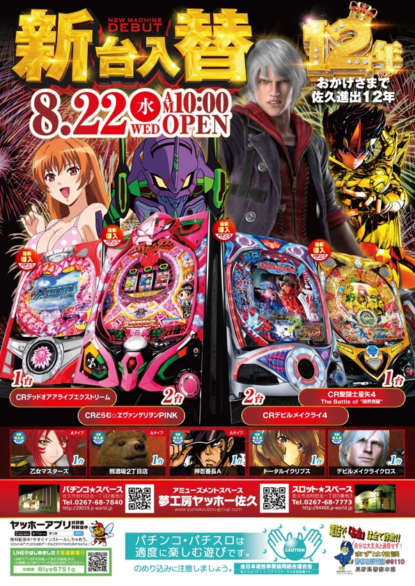 パチンコスペースに「CRどらむ☆ヱヴァンゲリヲンPINK」「CRデッドオアアライブエクストリーム」「CRデビルメイクライ4」「CR聖闘士星矢4」が新登場!