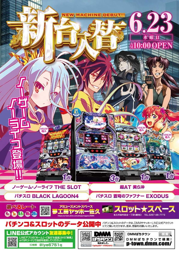 スロットスペースに【Sノーゲーム・ノーライフKG】【S超AT 美ら沖S】【SATブラックラグーン4SY】【蒼穹のファフナー EXODUS】が新登場!