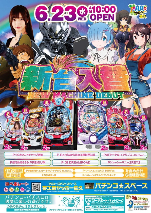 パチンコスペースに【P10カウントチャージ絶狼MC2台】【P Re:ゼロから始める異世界生活M06】【P銀河鉄道999 PREMIUM H1AU6】【P GI DREAMROAD-MH】【PAFトータル・イクリプスY【最新導入・2台】【Pジューシーハニー2REY2】が新登場!
