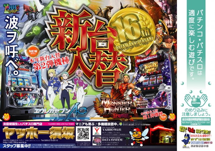 ヤッホー須坂の2017年新台入替第2弾は【エウレカセブンAO】。先週導入しました【モンスターハンター~狂竜戦線~】も好評稼働中!!!