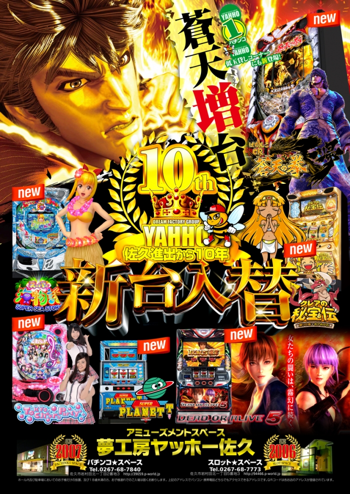 さらに、パチンコスペースには【SLOTデッド オア アライブ5】【クレアの秘宝伝~眠りの塔とめざめの石~】【スーパープラネットデラックス】の3機種が新登場!!!