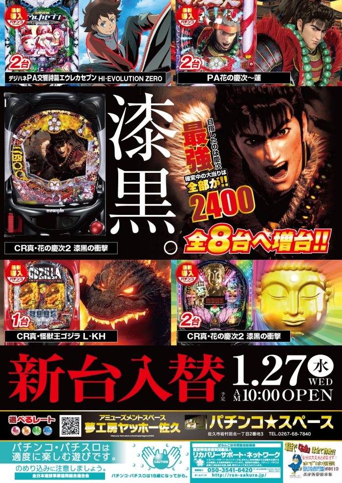 パチンコスペースに【PAエウレカセブンハイエボゼロssjd】【PA花の慶次蓮N-V】【CR真怪獣王ゴジラL-KH】【P真シャカRUSH】が新登場!