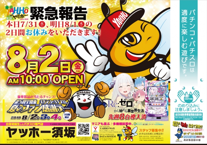 ヤッホー佐久パチンコ&スロット両店は、本日7/31と明日8/1の2日間、緊急店休日となります。