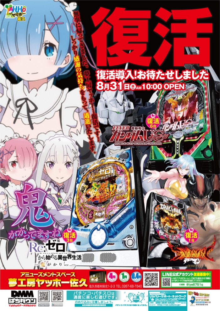 お待たせしました!【Pフィーバー機動戦士ガンダムユニコーン】【PRe:ゼロから始める異世界生活 鬼がかりver.M08】【Pデビルマン疾風迅雷S-X1 YT959】、遂に復活導入です!