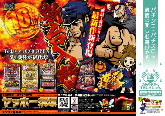 ヤッホー須坂が【押忍!番長3】が地域最速導入!!!さらに【ぱちスロAKB48バラの儀式】【クランキーセレブレーション】【クレアの秘宝伝~眠りの塔とめざめの石~】も同時導入!