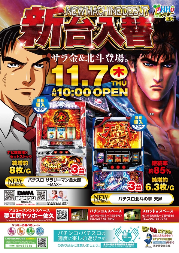 スロットスペースには【パチスロ サラリーマン金太郎~MAX~】【パチスロ北斗の拳 天昇】が新登場!