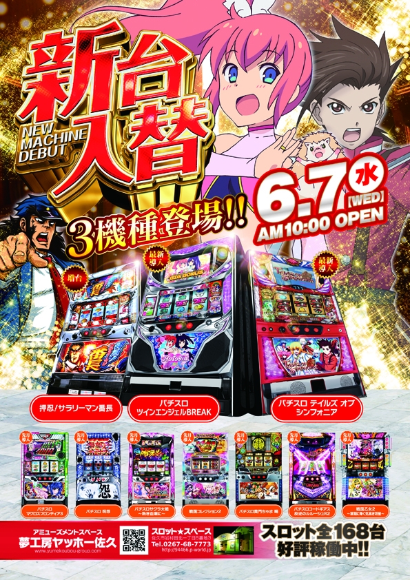 ヤッホー佐久スロットスペースに【パチスロツインエンジェルBREAK】【パチスロ テイルズ オブ シンフォニア】が新登場!さらに【押忍!サラリーマン番長】が増台!