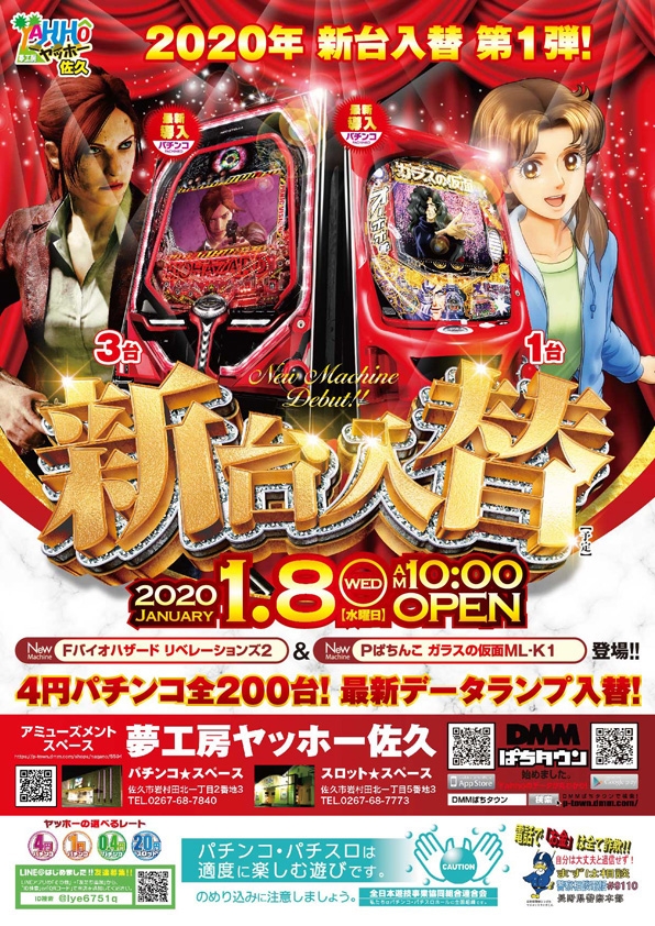 2020年ヤッホー佐久の新台入替第1弾は、パチンコスペースに【Fバイオハザード リベレーションズ2】【Pぱちんこ ガラスの仮面ML‐K1】が新登場!