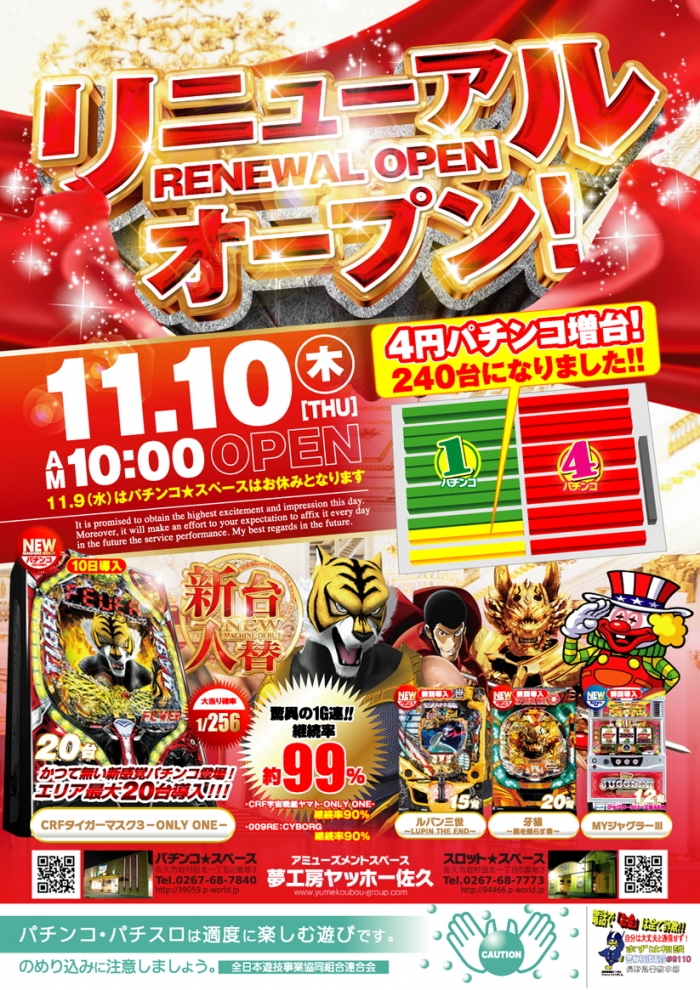 本日11月9日、リニューアル工事のため、ヤッホー佐久パチンコのみ店休日となります!明日10日は10時リニューアルオープンとなります!皆様のご来店をお待ちしております。